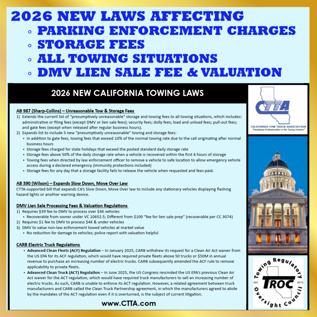 With the addition of the Towing Regulatory & Oversight Council (TROC) in 2013, CTTA Members gained a legislative branch dedicated solely to them. See more information HERE.